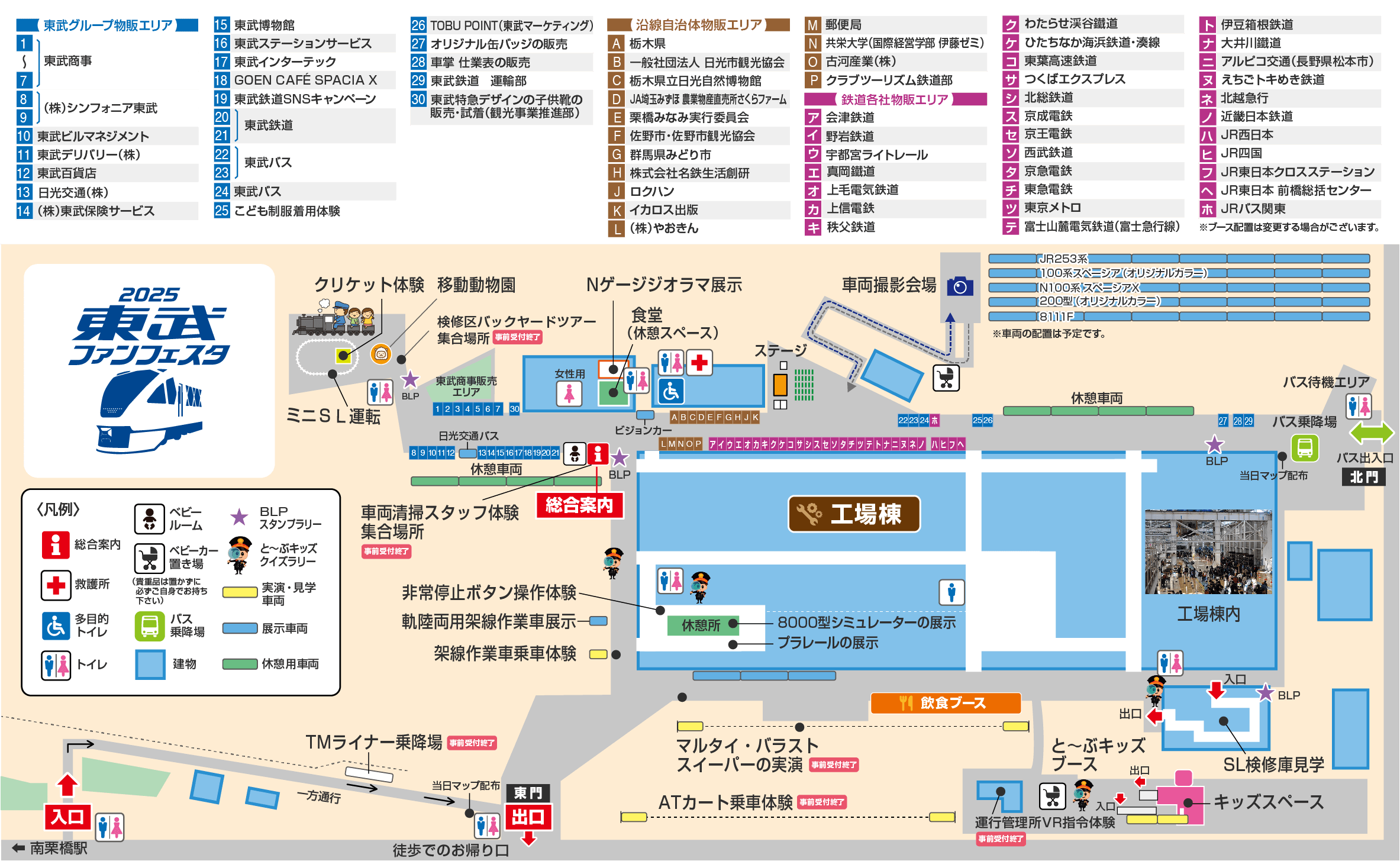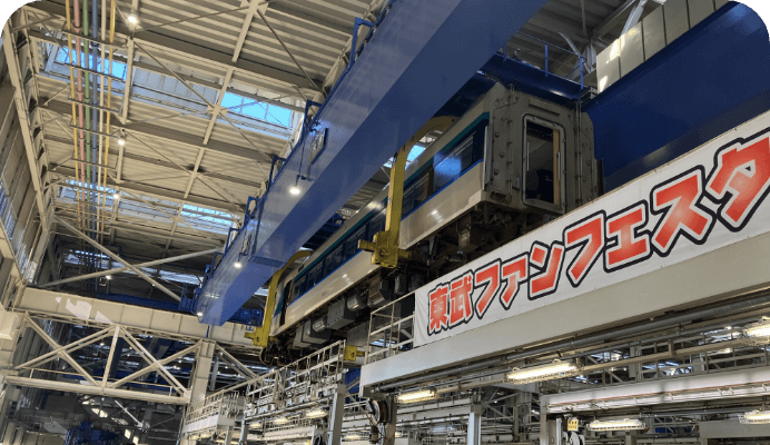 工場見学会や車両撮影会、保守用車両の体験乗車、そして東武鉄道オリジナルグッズや沿線自治体の物販・グルメまで。幅広い世代が楽しめるコンテンツをご用意しています。