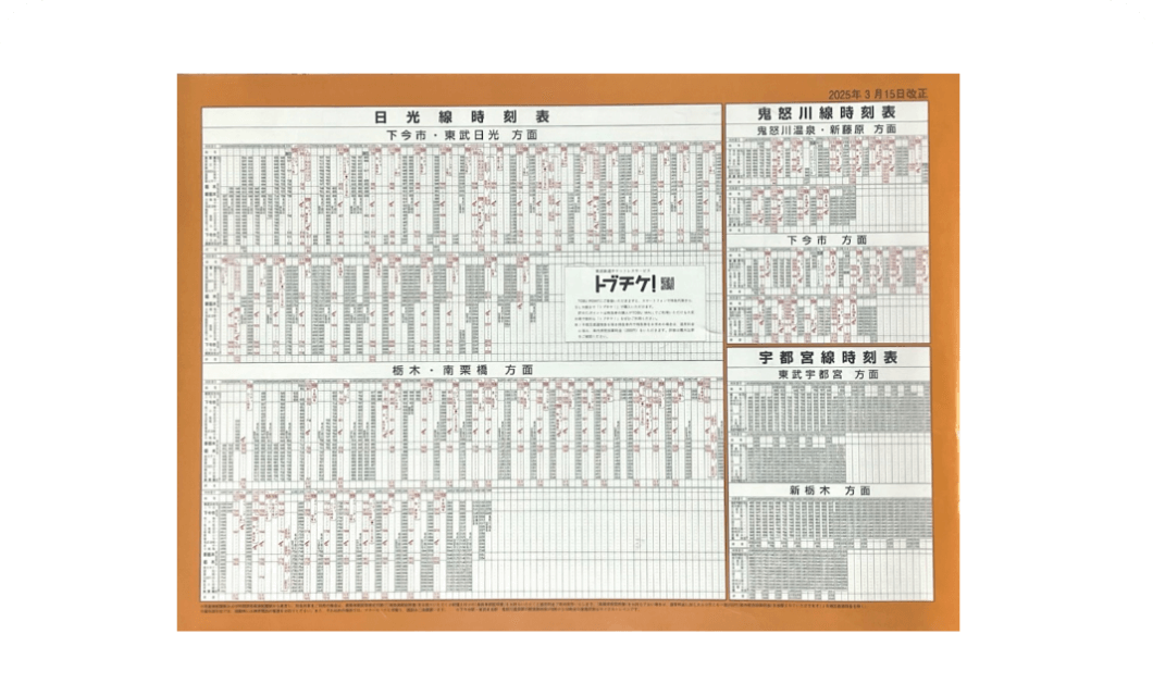 車内で掲出する未使用の時刻表です。東武日光線・東武伊勢崎線・東武東上線の3枚セットで販売いたします。