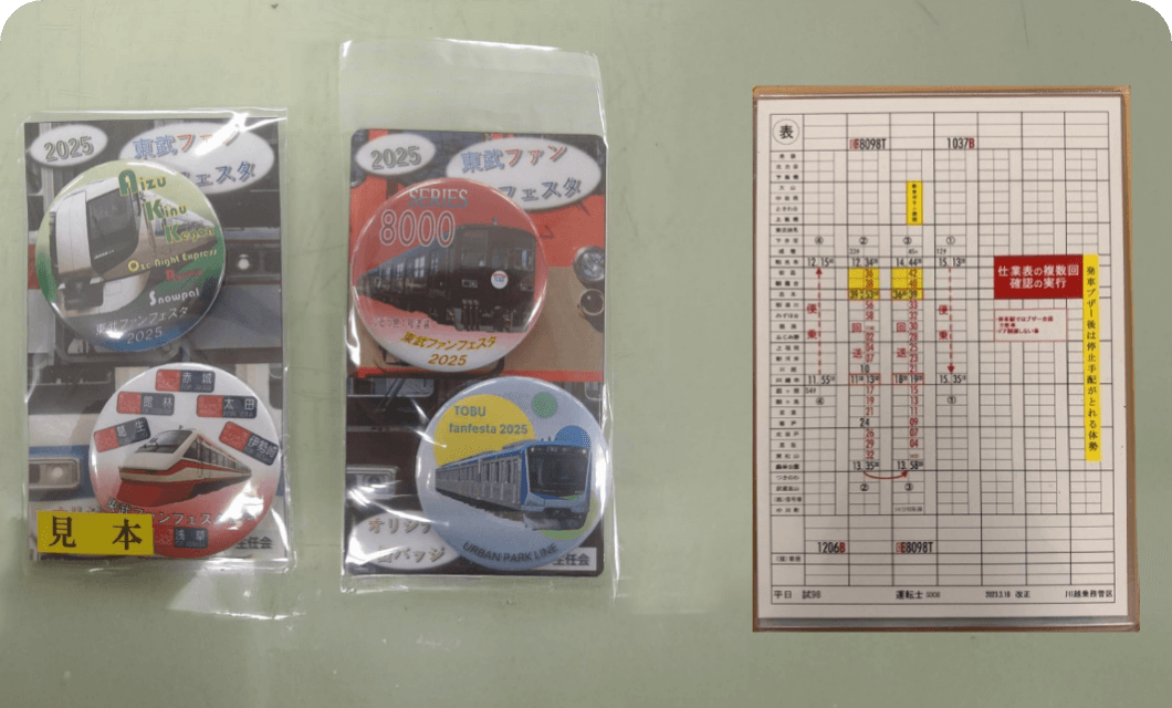 仕業表 1枚につき2,000円(税込)運輸部が本気で製作したファンフェスタオリジナルデザインの缶バッジと東上線で実際に使用していた仕業表の販売です。