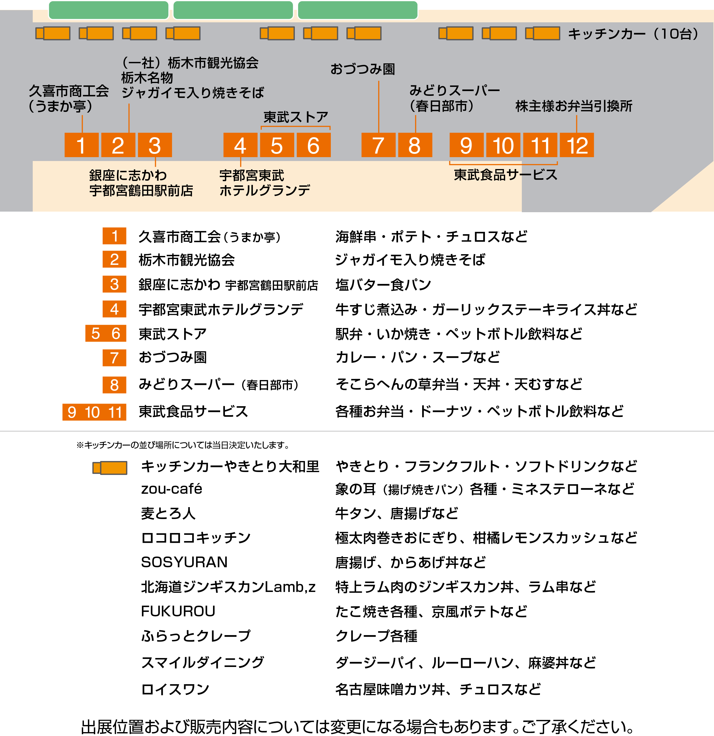 久喜市商工会(うまか亭) / 栃木市観光協会 / 銀座に志かわ 宇都宮鶴田駅前店 / 宇都宮東武ホテルグランデ / 東武ストア / おづつみ園 / みどりスーパー(春日部市) / 東武食品サービス